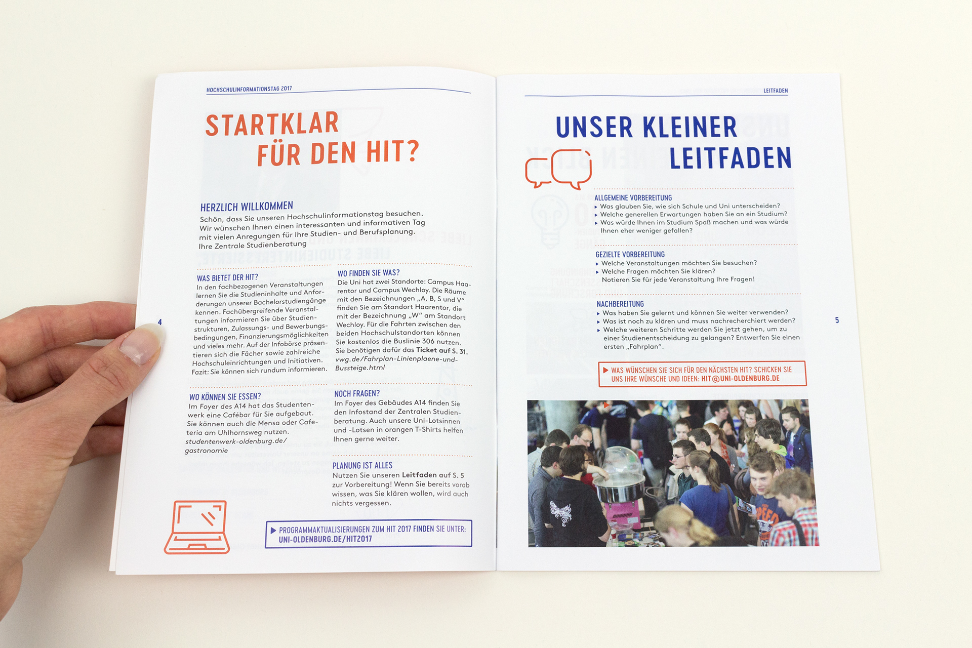 Um Schüler*innen über ihre Möglichkeiten an der Carl von Ossietzky Universität Oldenburg zu informieren, gibt es seit vielen Jahren den Hochschulinformationstag. Für den „HIT“ 2017 habe ich gemeinsam mit Andreas Magino im meinem Praxissemester eine übersichtliche Informationsbroschüre gestaltet, welche durch Farben, Icons und der generellen Gestaltung besonders für die junge Zielgruppe ansprechend ist.